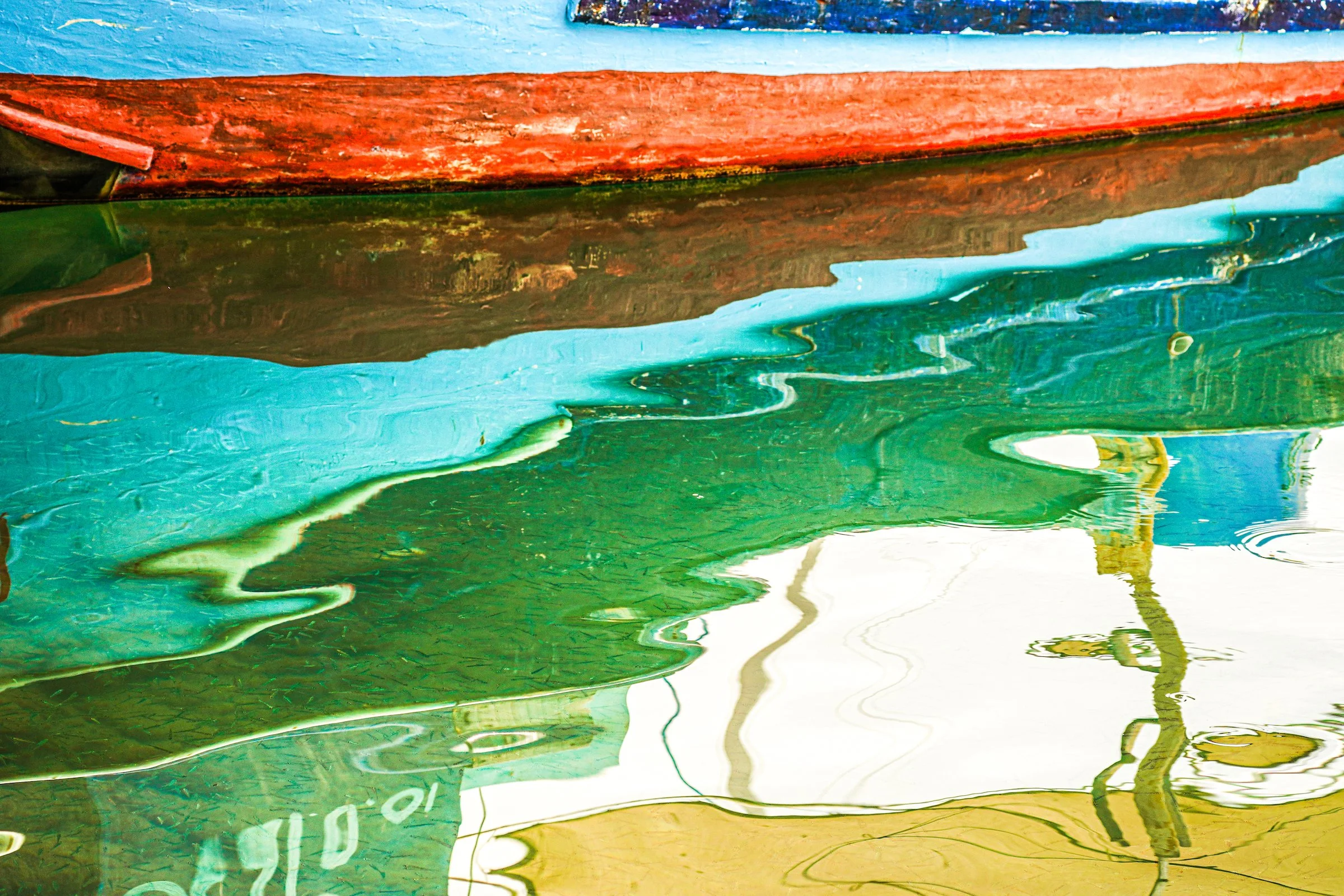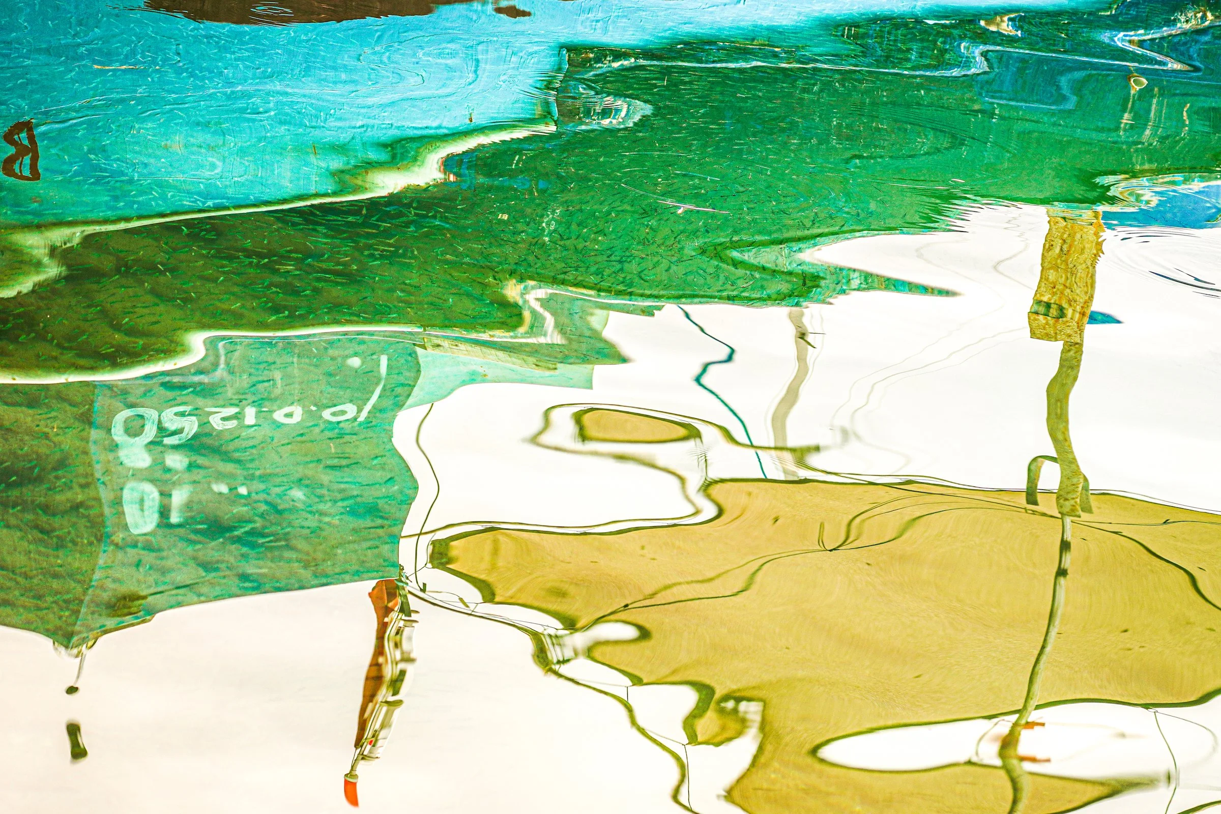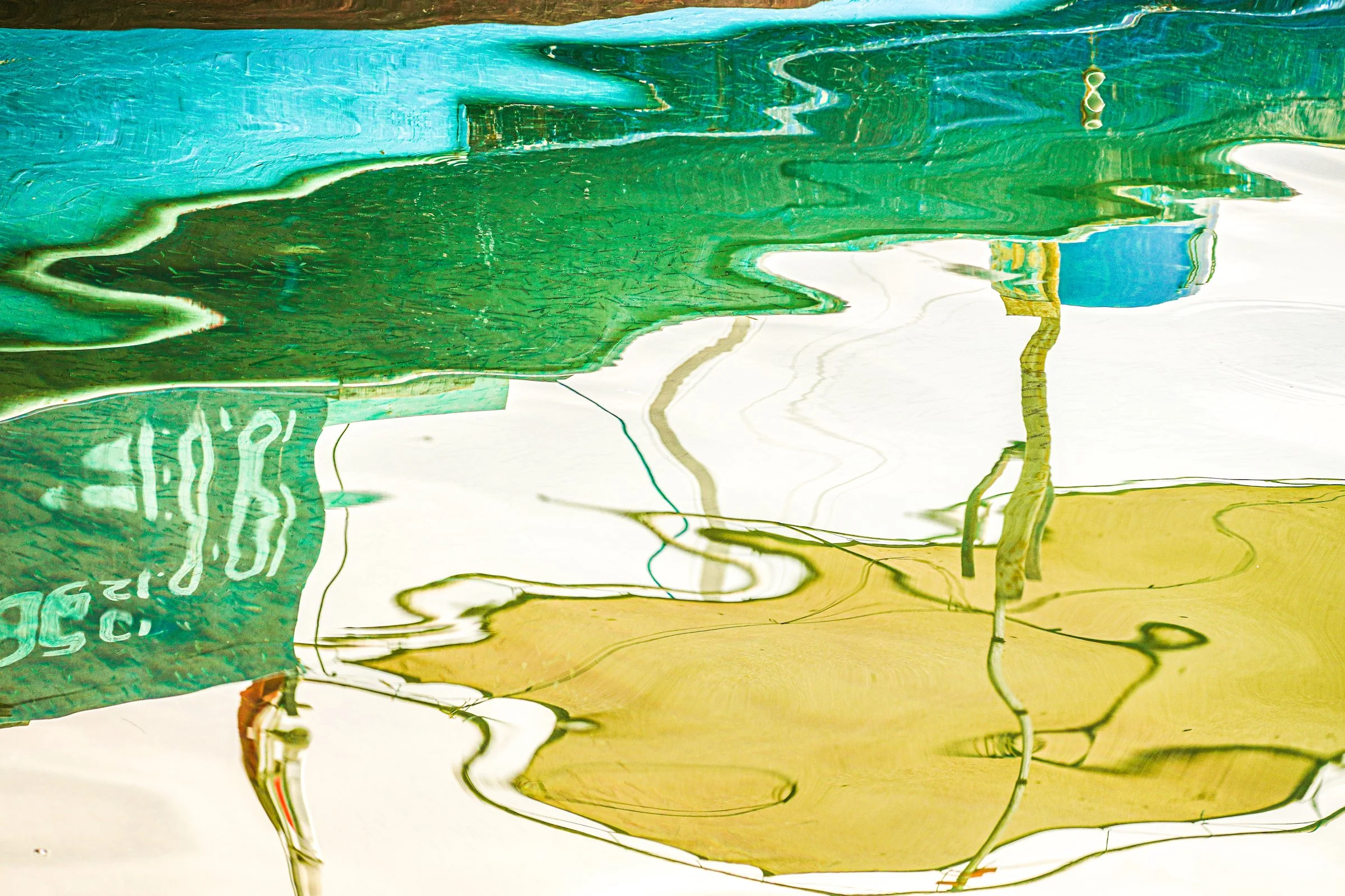 BETWEEN PRESENCE AND ABSENCE These reflections were captured during one of the last journeys I shared with my mother. We had spent the summer together in our home in Bodrum, drifting between long days by the sea and small adventures that stitched our time into memory. From Bodrum, we sailed across the Aegean to the Greek islands of Kos, Patmos, and Samos. Later, we drove north along the Turkish coast, from Çeşme to Ayvalık, pausing to walk through our family’s olive groves, and making an excursion inland to explore the ancient ruins of Assos. One afternoon in Assos, in a small fishing village, we stopped for a meal by the water. A fisherman’s boat named Dolunay was docked in front of us, and its painted hull and mast dissolved into the rippling surface of the harbor. While we waited for our food, I spent nearly an hour photographing nothing but those shifting reflections — colors breaking apart, recomposing themselves into fluid abstractions of blue, green, and ochre.